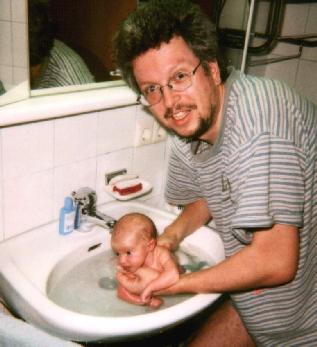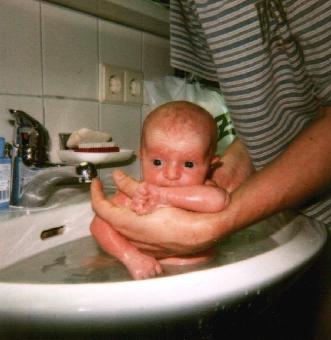 Heute (10.01.2000) ist mal wieder Badetag, das Waschbecken wird langsam zu klein für Alexa. Aber bisher ging das immer ganz gut.
